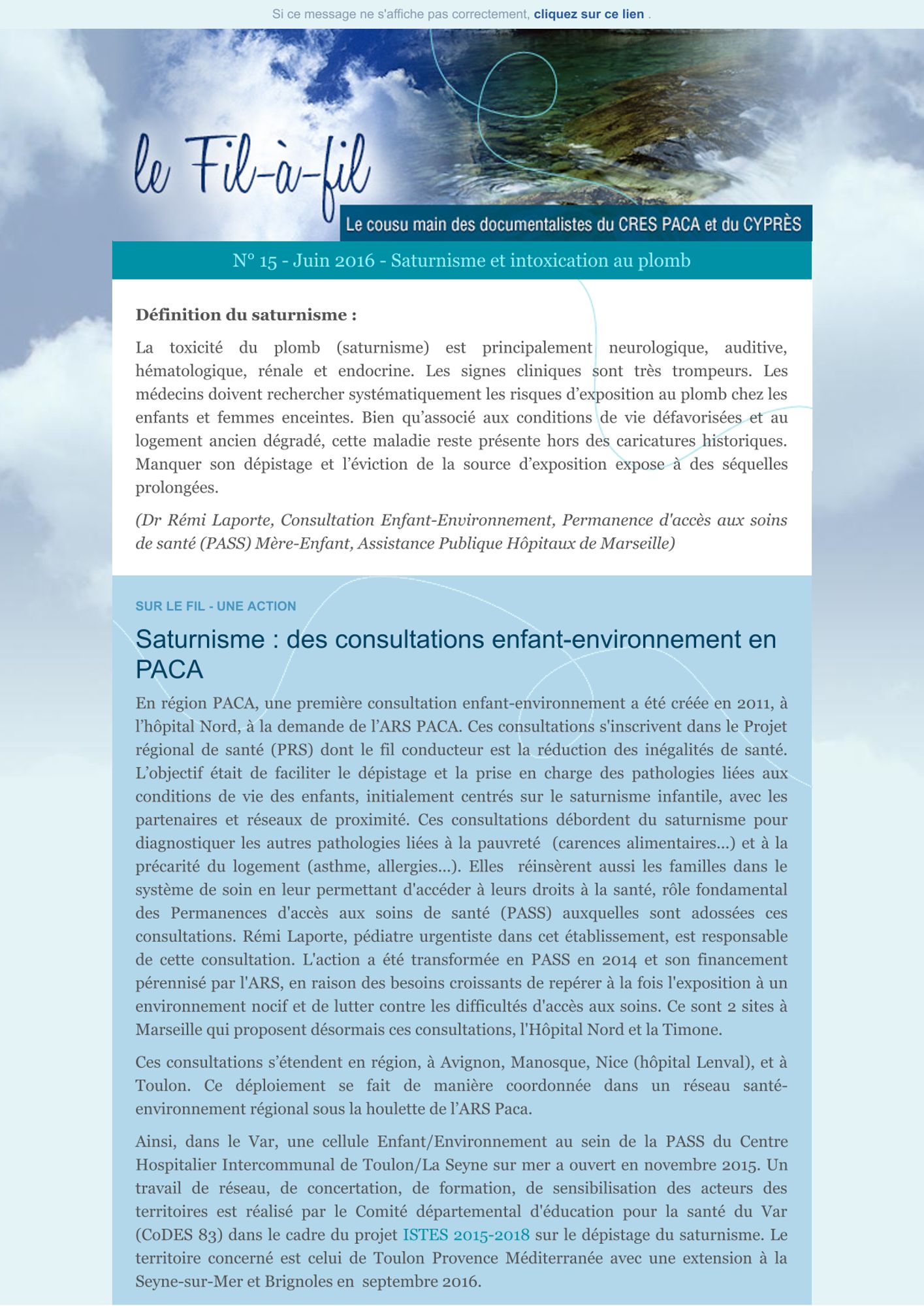 Ainsi, dans le Var, une cellule Enfant/Environnement au sein de la PASS du Centre Hospitalier Intercommunal de Toulon/La Seyne sur mer a ouvert en novembre 2015. Un travail de réseau, de concertation, de formation, de sensibilisation des acteurs des territoires est réalisé par le Comité départemental d'éducation pour la santé du Var (CoDES 83) dans le cadre du projet ISTES 2015-2018 sur le dépistage du saturnisme. Le territoire concerné est celui de Toulon Provence Méditerranée avec une extension à la Seyne-sur-Mer et Brignoles en septembre 2016.