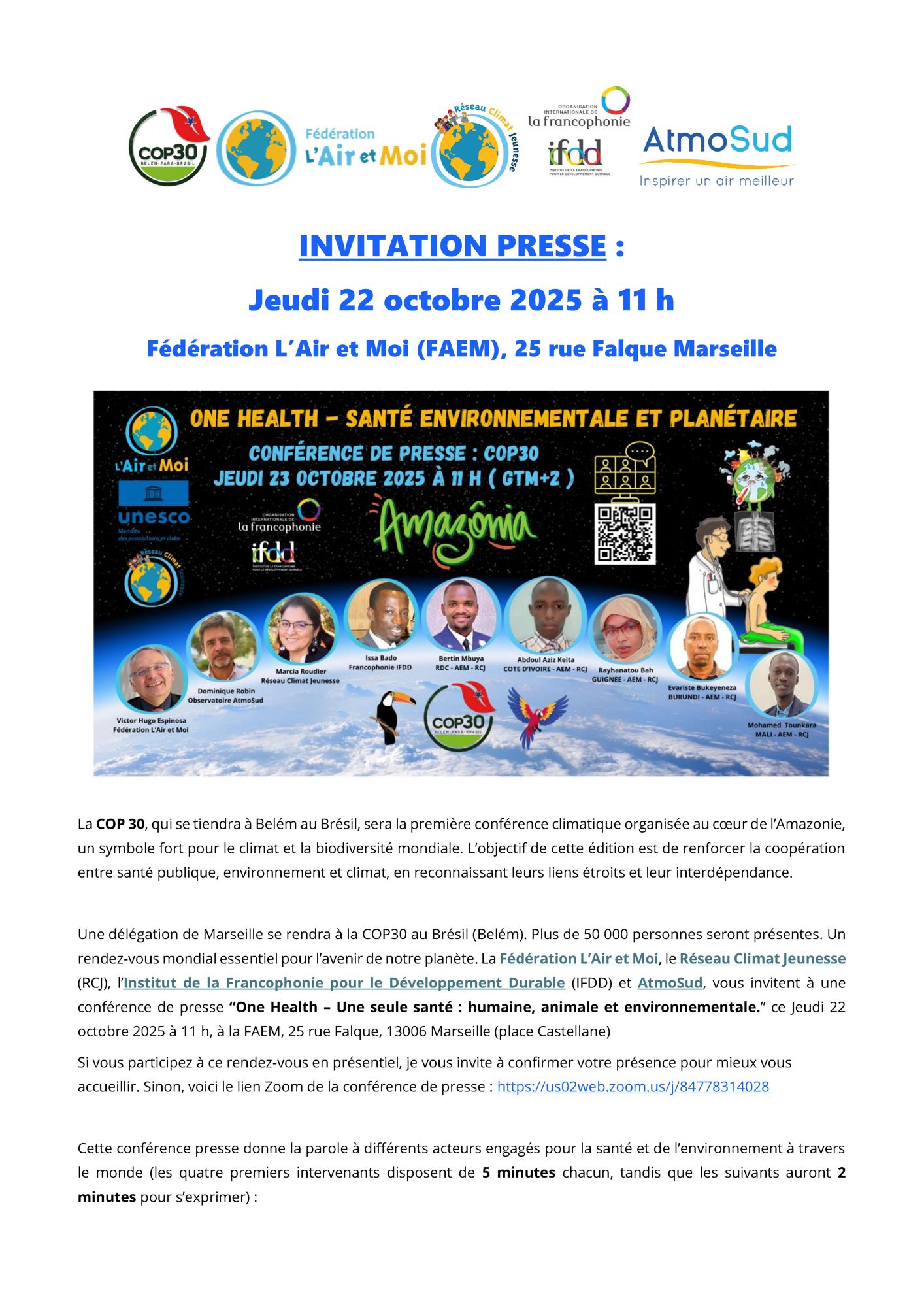 Une délégation de Marseille se rendra à la COP30 au Brésil (Belém). Plus de 50 000 personnes seront présentes. Un rendez-vous mondial essentiel pour l’avenir de notre planète. La Fédération L’Air et Moi, le Réseau Climat Jeunesse (RCJ), l’Institut de la Francophonie pour le Développement Durable (IFDD) et AtmoSud, vous invitent à une conférence de presse “One Health – Une seule santé : humaine, animale et environnementale.” à la FAEM, 25 rue Falque, 13006 Marseille (place Castellane)