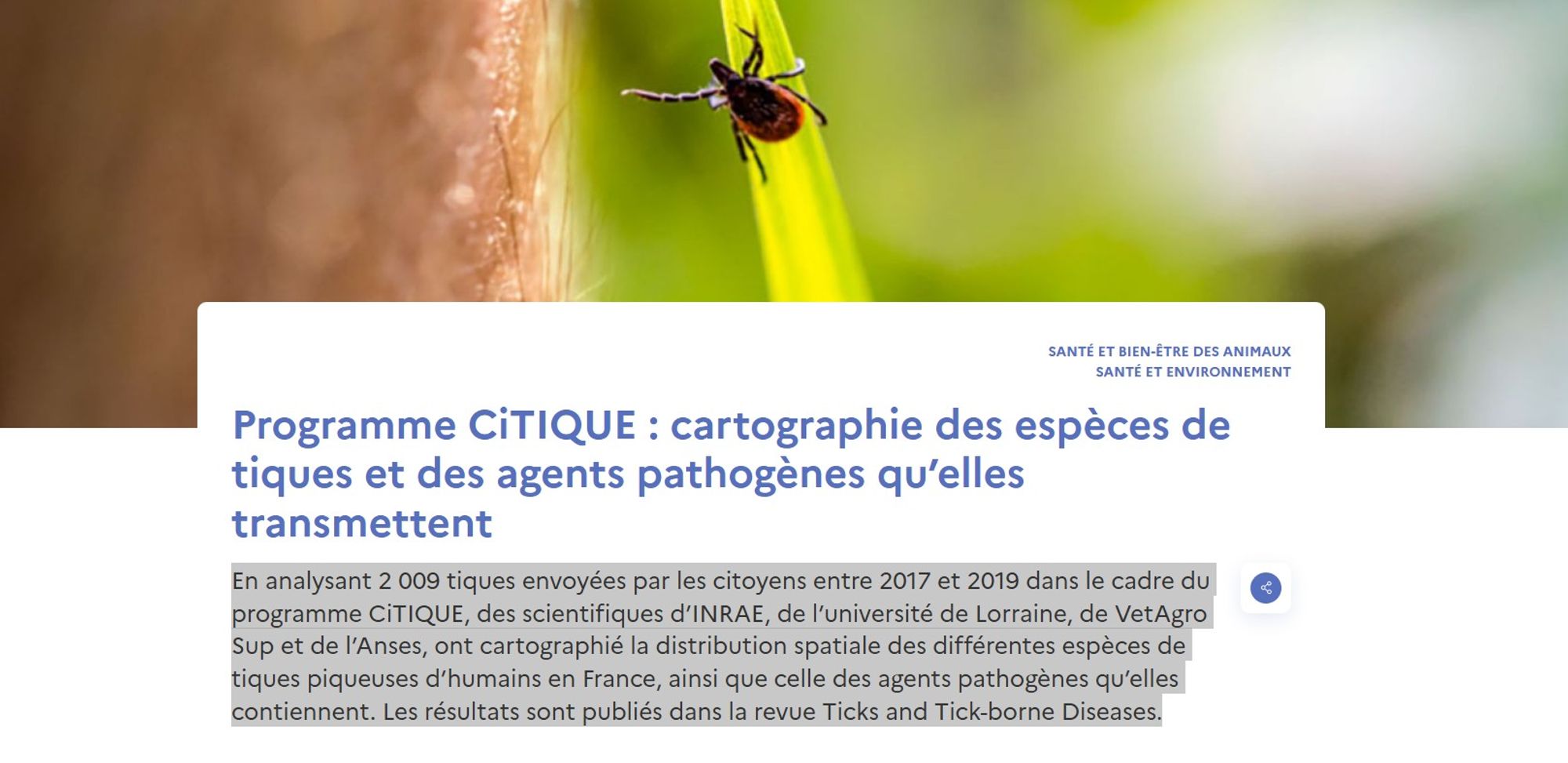 En analysant 2 009 tiques envoyées par les citoyens entre 2017 et 2019 dans le cadre du programme CiTIQUE, des scientifiques d’INRAE, de l’université de Lorraine, de VetAgro Sup et de l’Anses, ont cartographié la distribution spatiale des différentes espèces de tiques piqueuses d’humains en France, ainsi que celle des agents pathogènes qu’elles contiennent. Les résultats sont publiés dans la revue Ticks and Tick-borne Diseases.
